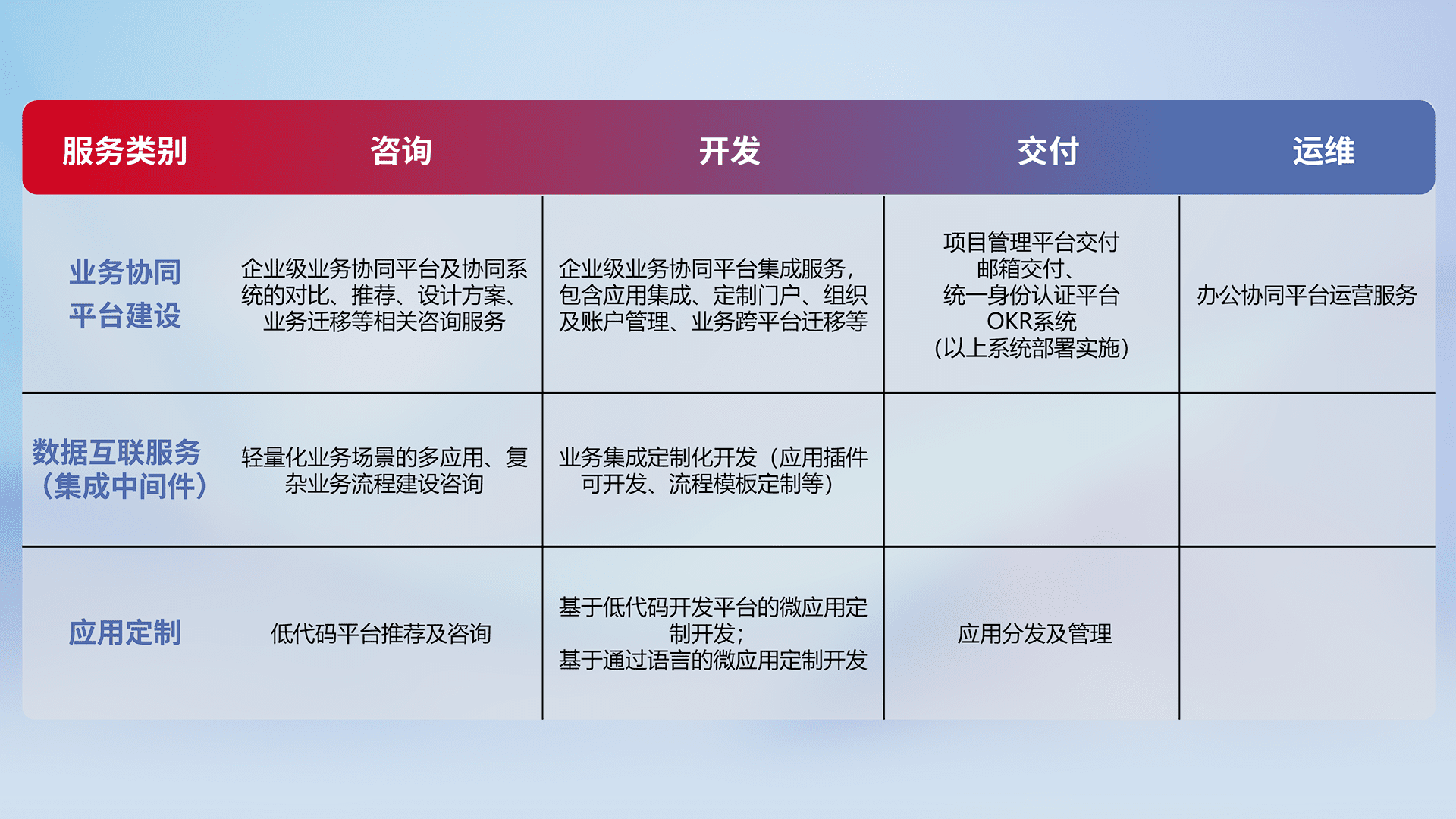 针对钉钉、、、企微、、、、IDaas等平台级产品提供产品的规划、、、、方案、、交付、、、、定制化开发等服务,,,实现如统一协同办公、、、、智能客户服务、、、混合会议管理、、、、智能数据查询、、等业务场景,,,实现数字化转型。。。。